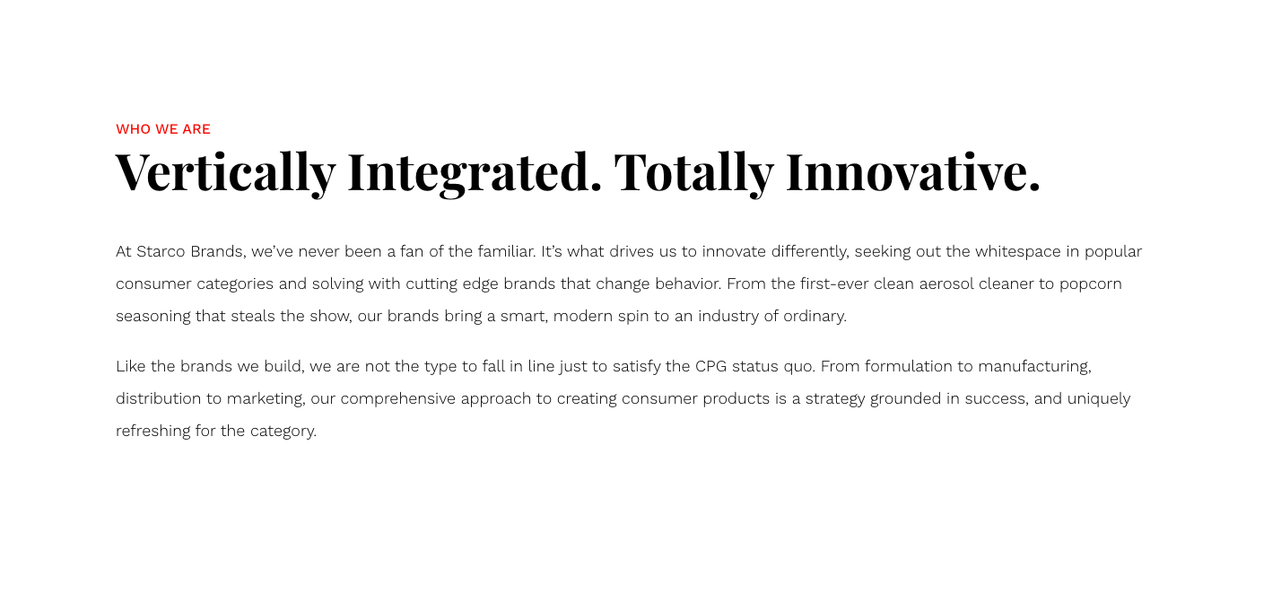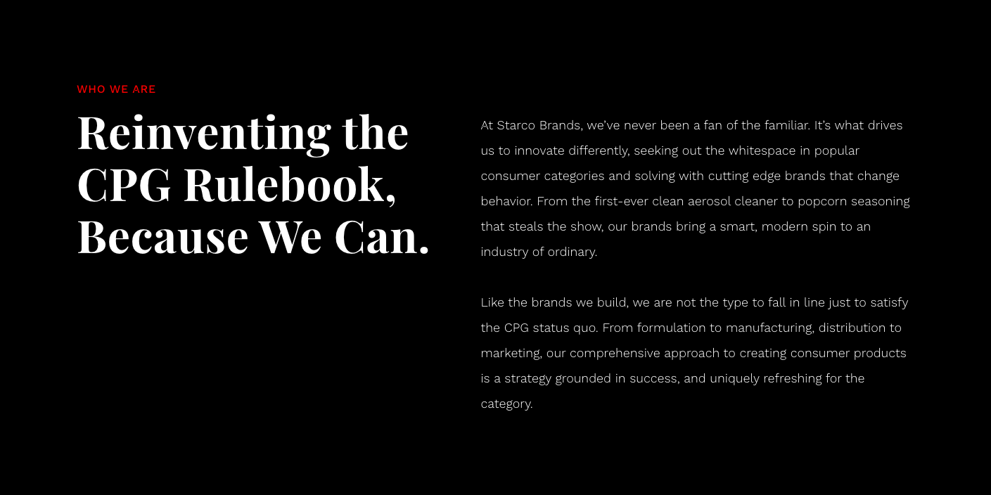 To capture Starco Brand's innovative spirit, we set out create a website that tells their story through bold, vibrant visuals and descriptive, witty words. The result: a fun, and informative user experience that takes you behind the curtain, and into the ever-changing and always inventive world of Starco.
